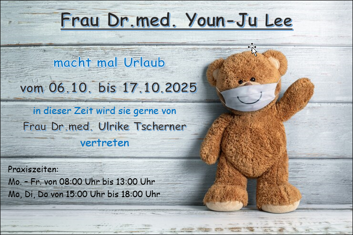 Für das Vertrauen und die schöne Zeit möchte ich mich bei allen Patienten herzlich bedanken. Ich freue mich, dass ich eine engagierte, nette Nachfolgerin Frau Dr. Lee finden konnte, die die Praxis mit Frau Dr. Tscherner weiterführen wird.
